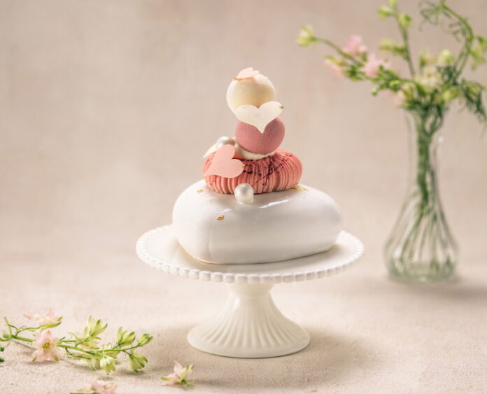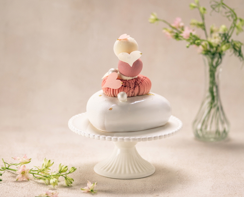 사랑을 상징하는 하트 모티브를 입체적으로 표현한 ‘라 비앙 블랑’ 케이크의 가격은 8만 5천원이며, 3월 9일부터 3월 14일까지 구매 가능하다.