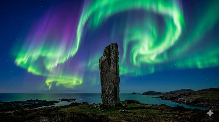 현지인들이 **’메리 댄서스(The Merry Dancers)’**라 부르는 이 빛의 향연은 북해의 밤하늘을 녹색과 보라색의 물결로 뒤덮는다. 고대 스탠딩 스톤 위로 오로라가 춤을 추는 장면을 마주하는 것은, 30억 년 전의 대지와 우주의 에너지가 조우하는 경이로운 찰나다.